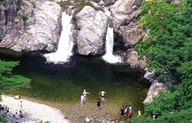 经过宝镜寺溪水连绵的山路不断延伸,大概行走 1.5km左右会有第一瀑布双生瀑布。虽然不是很壮观但是两条明朗的瀑布看起来很端雅。经过此瀑布继续行走会有宝贤瀑布(第二瀑布) 三宝瀑布(第三瀑布) 藏龙瀑布(第四瀑布) 乌峰瀑布(第五瀑布). 其中藏龙瀑布周围的溪谷曾出现在电影 ‘南部军'中。